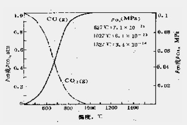 即 碳的直接氧化,即石墨在高溫下由于與空氣(O2)、水蒸汽(H2O)和碳酸氣等共存而被氧化。石墨在560℃以上就開始顯著氧化而使含碳制品脫碳損耗,由 圖可以看出右邊部分已被氧化成為脫碳區(qū),在脫碳區(qū)中由于碳的氧化而形成了許多擴散通道,氧氣和熔渣通過擴散通道進入磚內(nèi),在界面處和碳反應(yīng),反應(yīng)產(chǎn)物通過 擴散通道擴散出去。由下圖可以看出在1000℃時,系統(tǒng)中主要以CO氣體形式存在,Pco≈0.1Mpa,生成的CO氣體向外擴散,阻止了O2及其它氣體 的進入,從而起到氣態(tài)“抗氧化劑”效果,所以碳是能夠穩(wěn)定存在的,但出鋼后冷卻過程中有可能被空氣氧化。同時含碳制品襯磚表面上附有渣層,可防止由空氣引 起碳的氧化,起到保護膜的作用,這種保護作用在1000℃以上特別明顯。