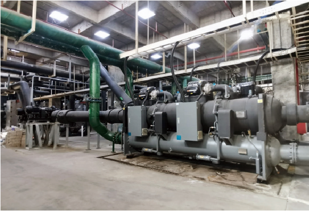 富士康觀瀾園區(qū)B25棟中央空調(diào)機(jī)房位于二層能源中心,冷卻塔位于樓頂屋面,2010年建設(shè)并投入使用,主要對(duì)B10、B11、B12、B13棟廠房生產(chǎn)車間供冷。供冷主機(jī)為4臺(tái)麥克維爾3867.6KW離心式制冷主機(jī),1臺(tái)麥克維爾1933.8KW離心式制冷主機(jī),1臺(tái)麥克維爾1760螺桿制冷主機(jī)組成,系統(tǒng)全年處于運(yùn)行狀態(tài)。