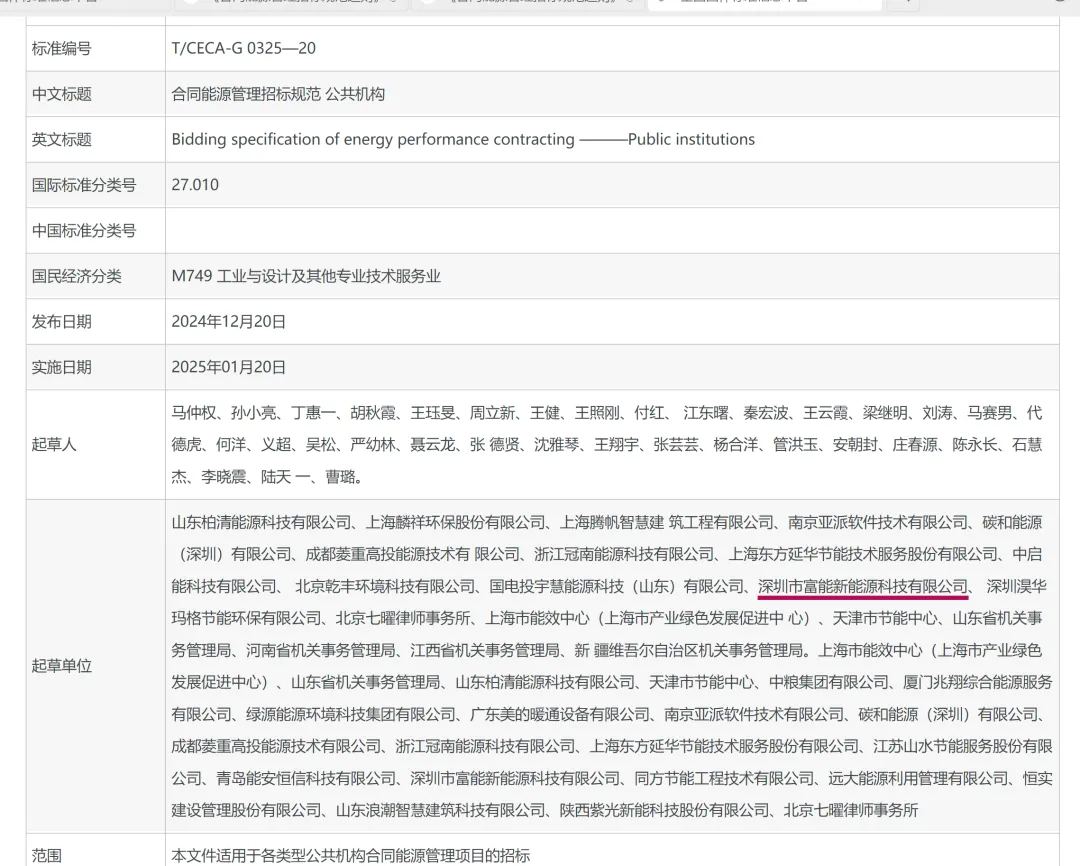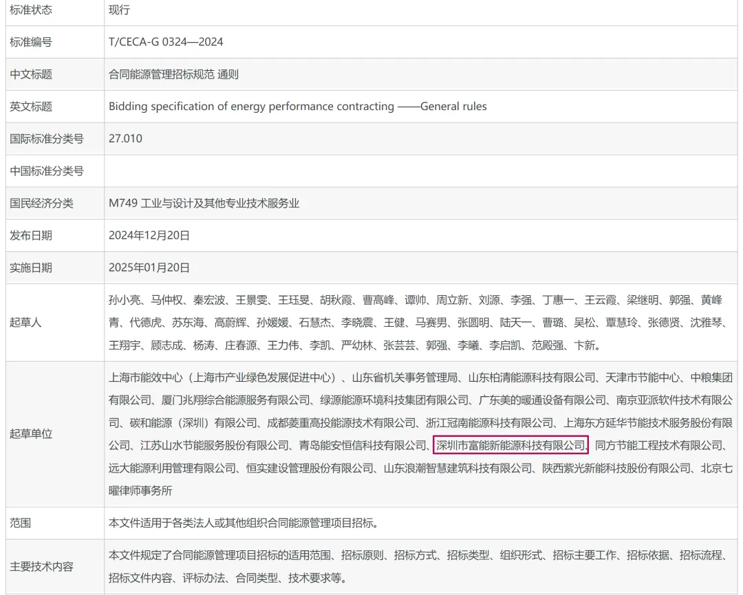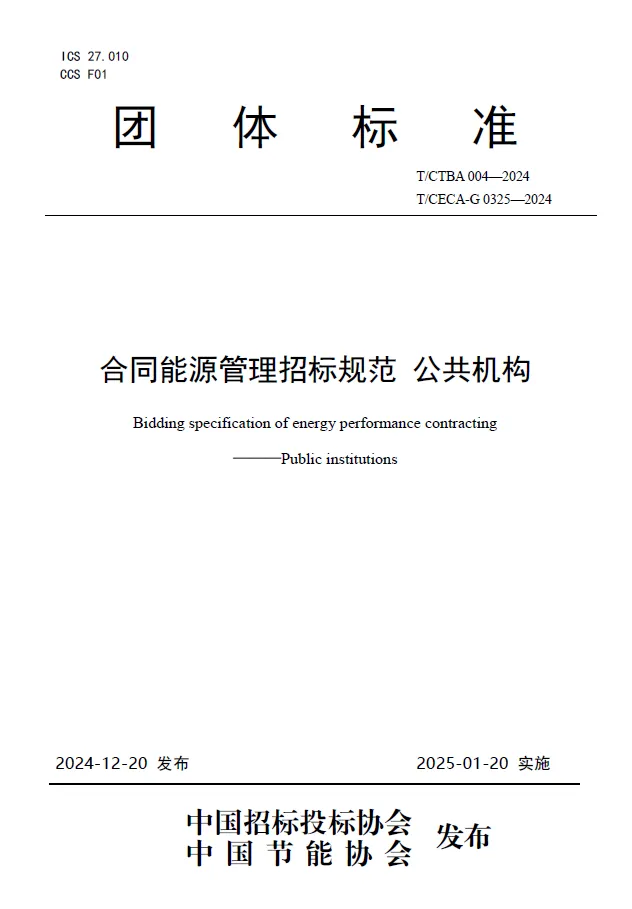 2024年12月20日,由中國(guó)招標(biāo)投標(biāo)協(xié)會(huì)、中國(guó)節(jié)能協(xié)會(huì)共同歸口,中國(guó)節(jié)能協(xié)會(huì)節(jié)能服務(wù)產(chǎn)業(yè)委員會(huì)組織起草的《合同能源管理招標(biāo)規(guī)范 通則》《合同能源管理招標(biāo)規(guī)范 公共機(jī)構(gòu)》《合同能源管理招標(biāo)規(guī)范 軌道交通》三項(xiàng)團(tuán)體標(biāo)準(zhǔn)正式發(fā)布。富能參與了《合同能源管理招標(biāo)規(guī)范 通則》《合同能源管理招標(biāo)規(guī)范 公共機(jī)構(gòu)》兩項(xiàng)團(tuán)體標(biāo)準(zhǔn)制定工作。