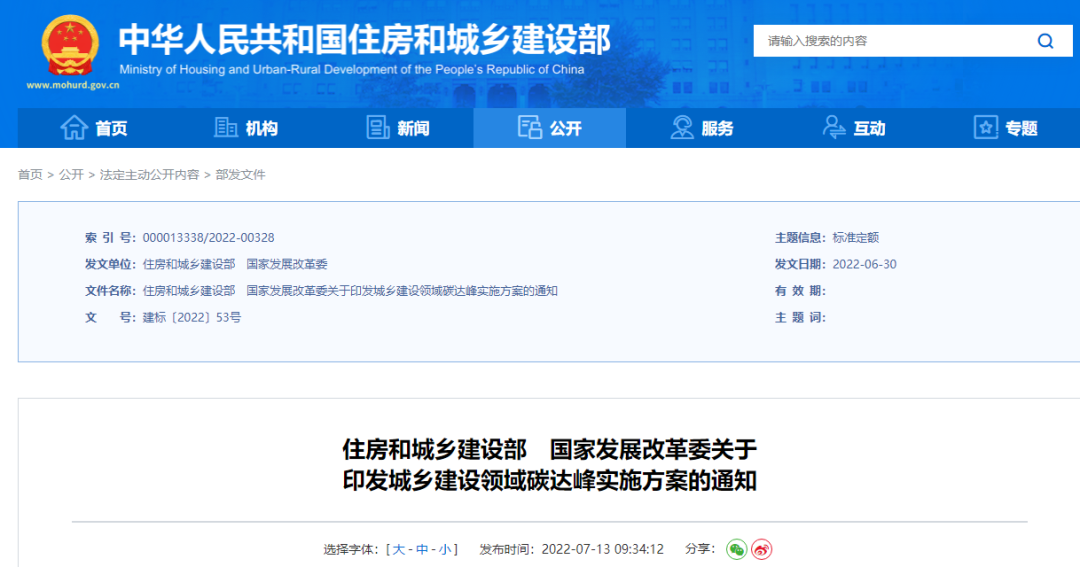 7月13日,住建部、國家發(fā)改委發(fā)布關(guān)于印發(fā)《城鄉(xiāng)建設(shè)領(lǐng)域碳達(dá)峰實(shí)施方案》的通知。
