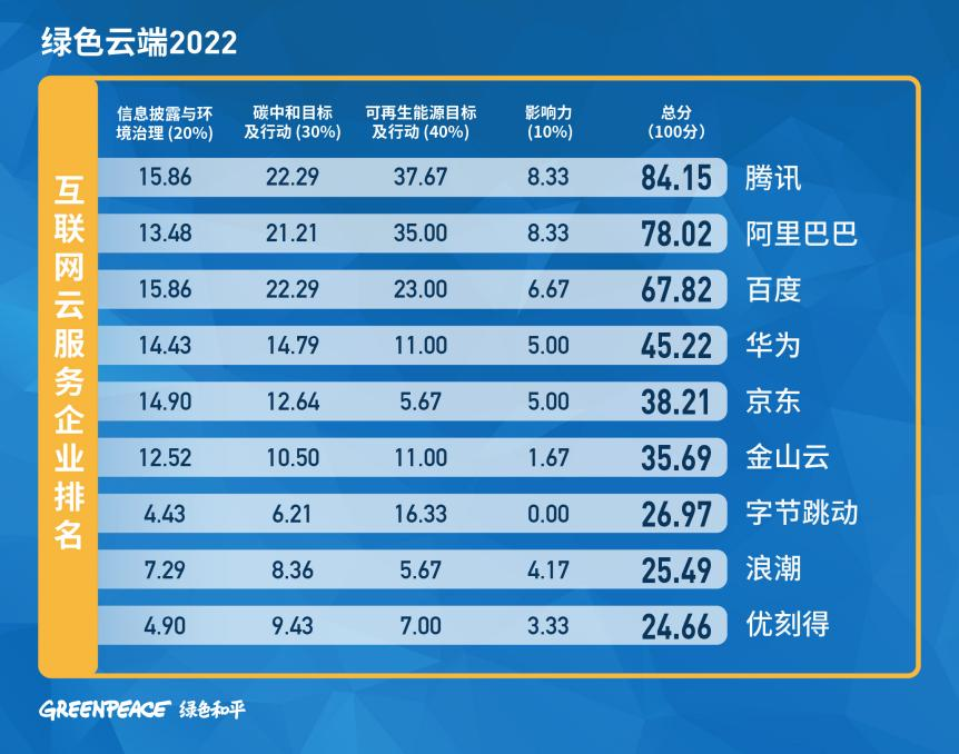 7月12日, 國際環(huán)保機(jī)構(gòu)綠色和平與中華環(huán)保聯(lián)合會(huì)共同發(fā)布《綠色云端2022》報(bào)告(以下簡(jiǎn)稱“報(bào)告”),對(duì)國內(nèi)24家領(lǐng)先互聯(lián)網(wǎng)云服務(wù)與數(shù)據(jù)中心企業(yè)的碳中和表現(xiàn)進(jìn)行排名。