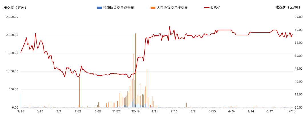 其中,掛牌協(xié)議交易成交量3259.28萬噸,成交額15.56億元;大宗協(xié)議交易成交量1.61億噸,成交額69.36億元。