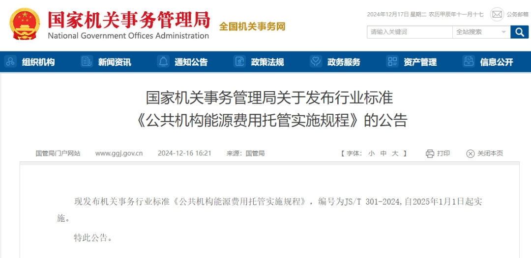 12月16日,國家機關(guān)事務(wù)管理局發(fā)布行業(yè)標(biāo)準(zhǔn)《公共機構(gòu)能源費用托管實施規(guī)程》(下稱“規(guī)程”),編號為JS/T 301-2024。該標(biāo)準(zhǔn)將于2025年1月1日起正式實施?!兑?guī)程》規(guī)定了公共機構(gòu)能源費用托管實施涉及的前期評估、組織采購、合同簽訂、組織實施、項目調(diào)整、效果評估、資產(chǎn)管理和費用結(jié)算的管理要求,適用于公共機構(gòu)能源費用