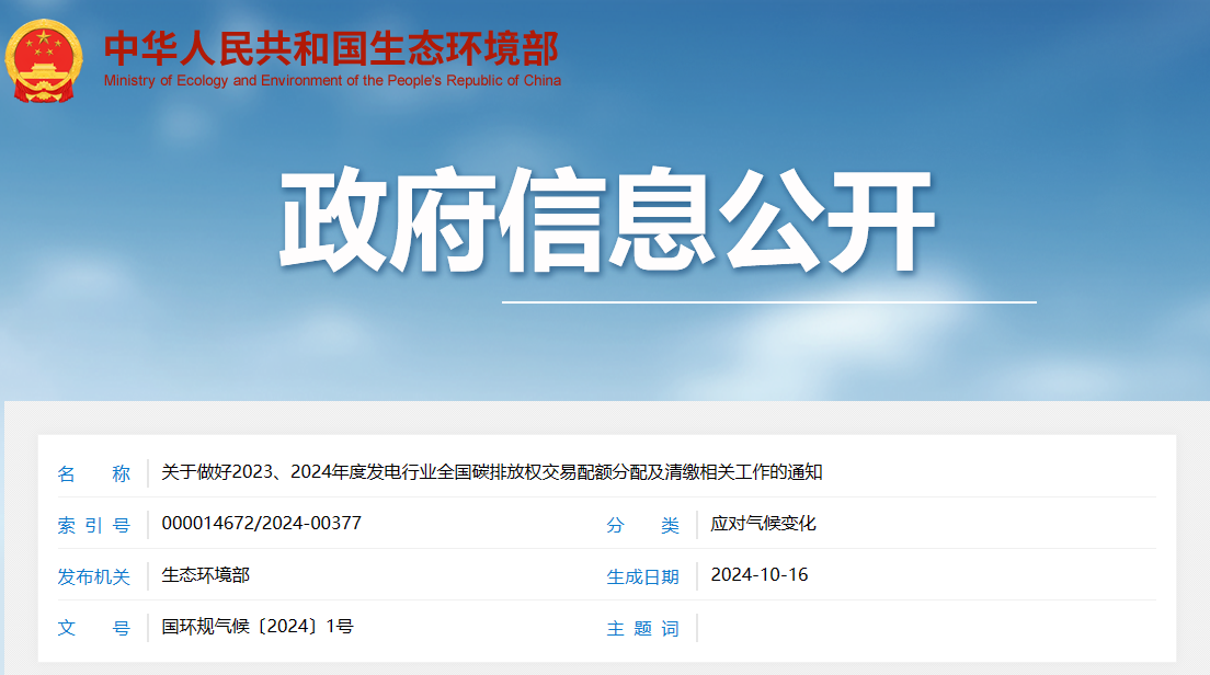 生態(tài)環(huán)境部印發(fā)《關(guān)于做好2023、2024年度發(fā)電行業(yè)全國碳排放權(quán)交易配額分配及清繳相關(guān)工作的通知》