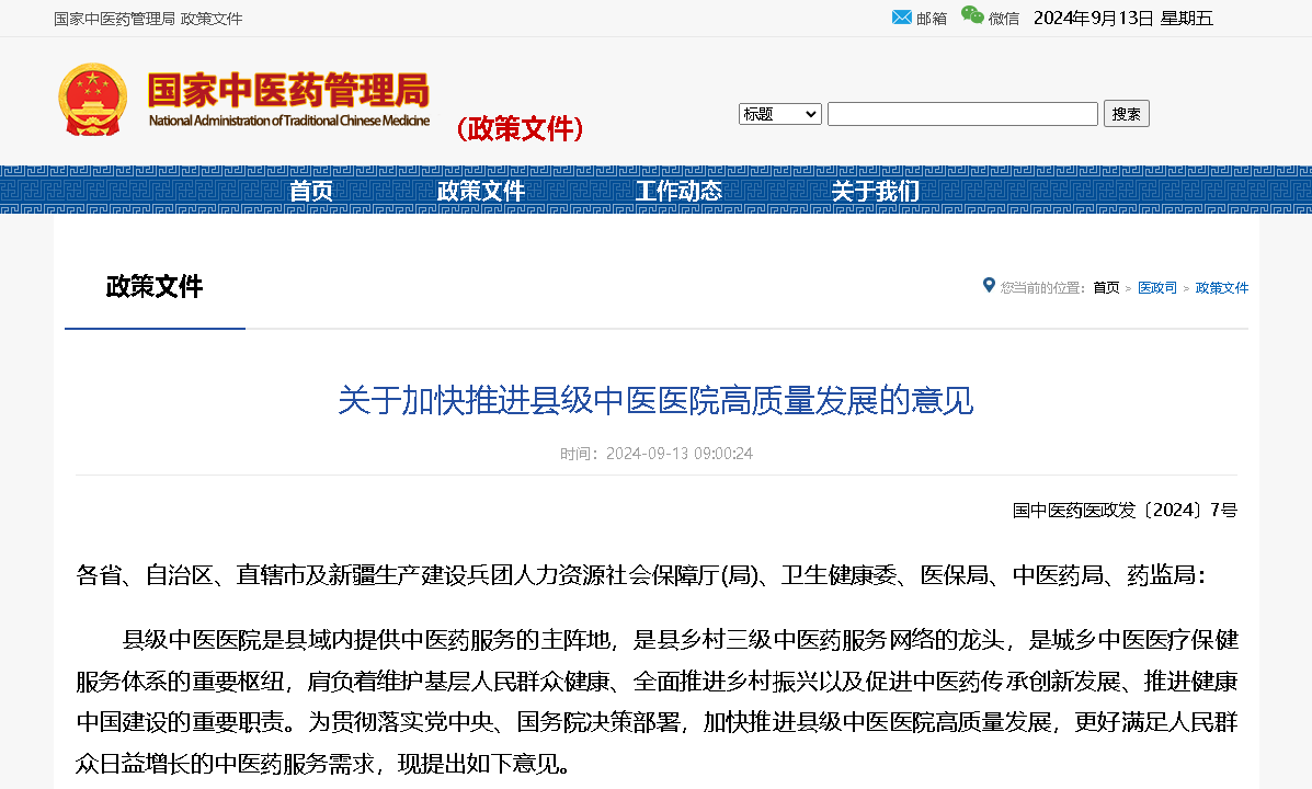 國家中醫(yī)藥局等五部門發(fā)布《關(guān)于加快推進(jìn)縣級中醫(yī)醫(yī)院高質(zhì)量發(fā)展的意見》